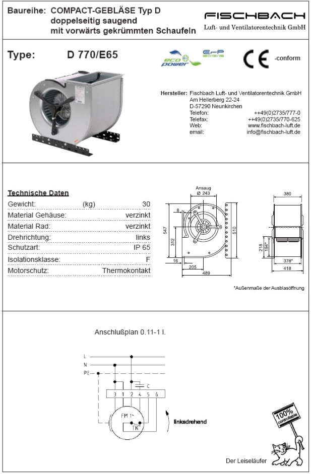 - Motorschutzart IP 65 (elektrischer Teil) nach DIN 40050 mit CE-Zeichen.